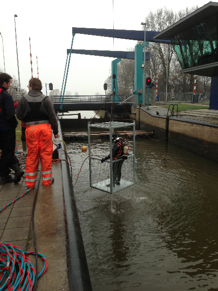 Eerst hebben wij geassisteerd met het plaatsen van de schotbalken voor de droogzetting. Omdat de sluis niet geheel drooggezet kon worden, is de betonnen sluiskolk- en bodem onder de waterlijn door ons gereinigd met water onder hoge druk.